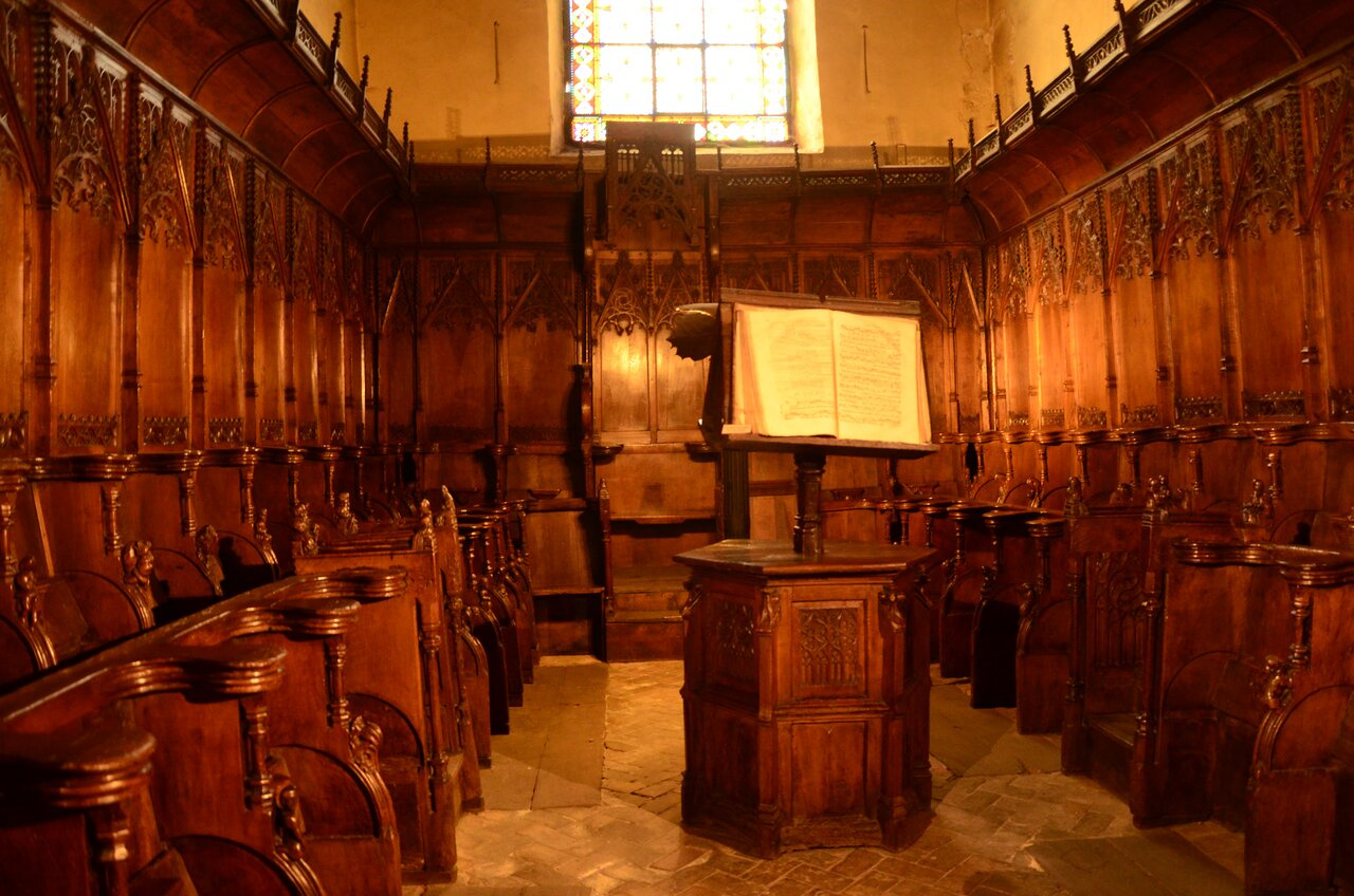 Книга церковных песен с нотами. Близко подходить нельзя. И сиденья эпохи ренессанс.