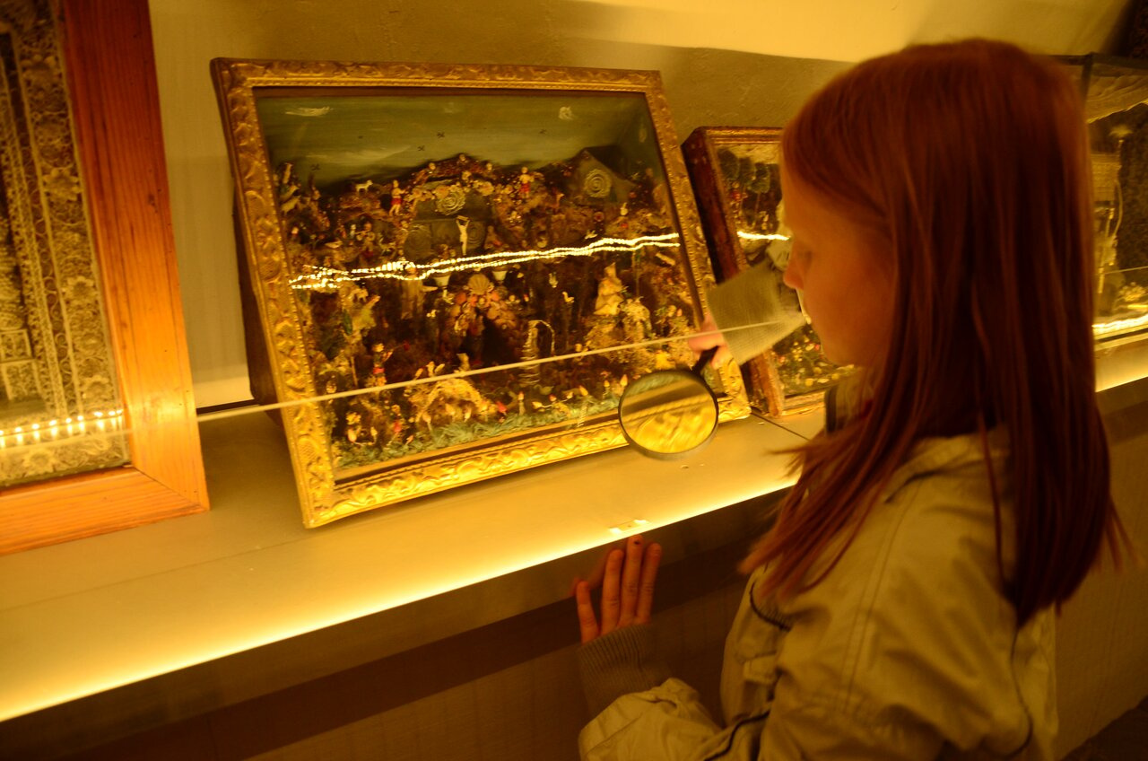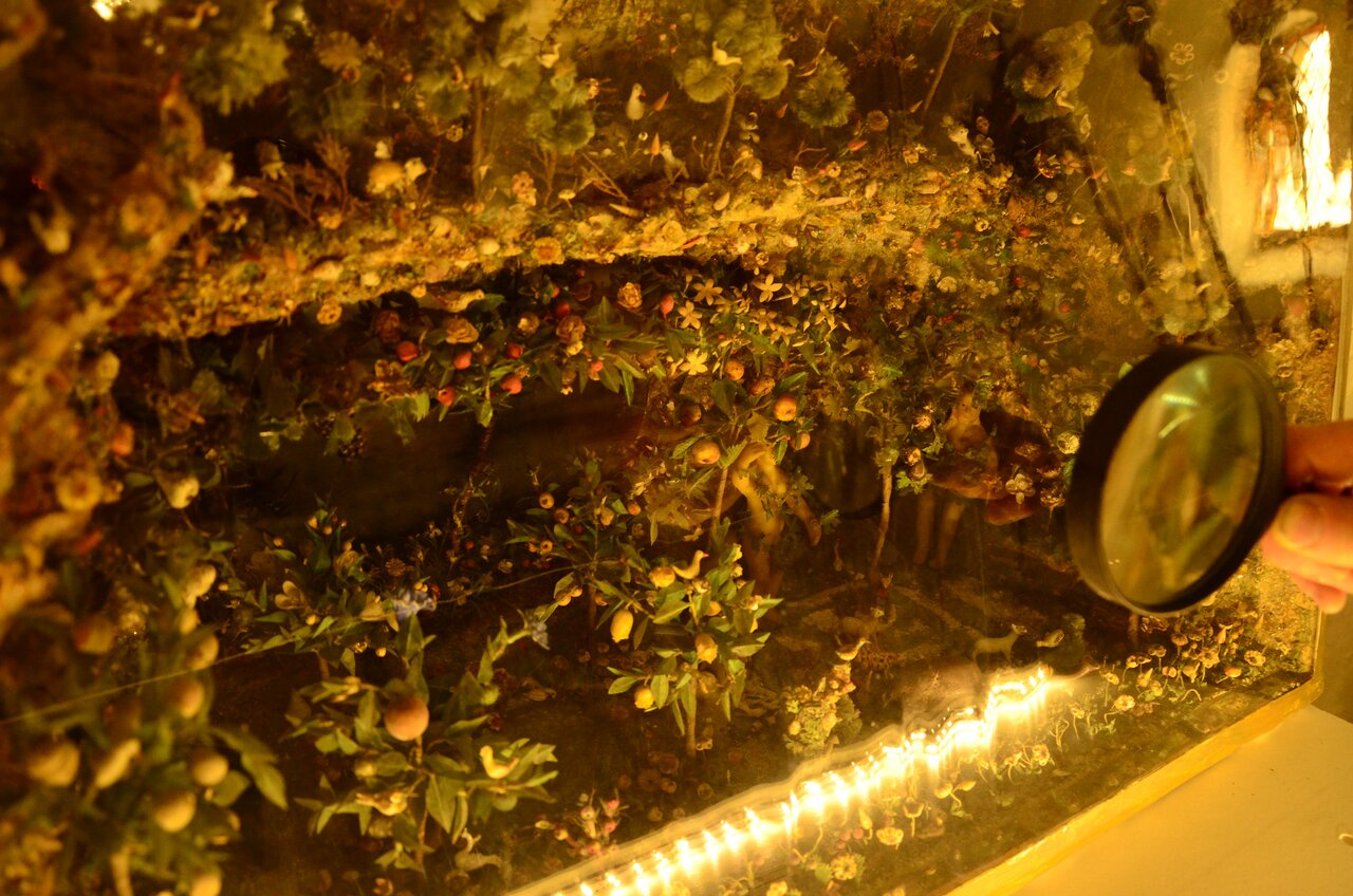 Очень интересно представлены композиции библейские. Например, эта сделана полностью из бумаги. Когда мелкие кусочки скручиваешь и делаешь композицию. Есть лупы, чтобы всё разглядывать.