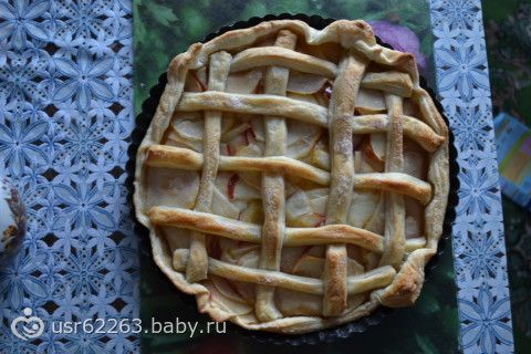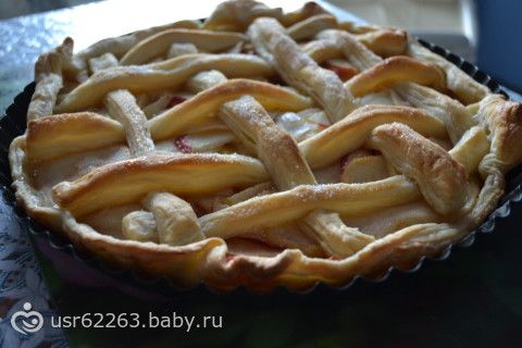 Тесто использую готовое слоеное. Там 4 пласта. Смазываю противень. 2пласта раскатываю, укладываю на противень. Сверху яблоки (можно немного ягод замороженых или свежих), посыпаю сахаром. Из 2-х оставшихся вырезаю полосочки, укладываю, как на фото, и тоже присыпаю сахаром. В духовке готовиться моментально! (на 180гр., предварительно разогрев духовку)