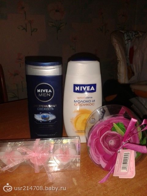 а это гели для душа для меня и мужа свечки и цветочек пишится что лепестки преврашяются в пену для ванной я такого еще не видела
