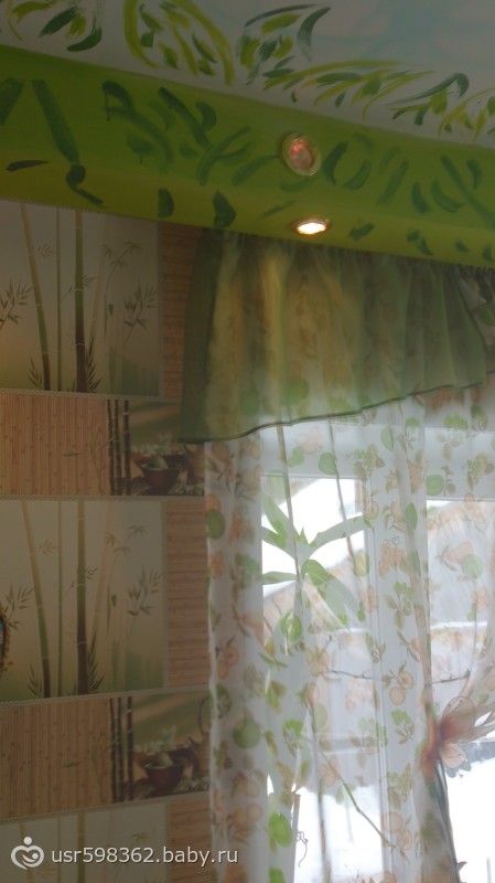 вот как то так, на коробе и на потолке папа у нас рисовал, типо продолжение обоев, но у нас кухня светлая 2 окнатемновато, но интересна