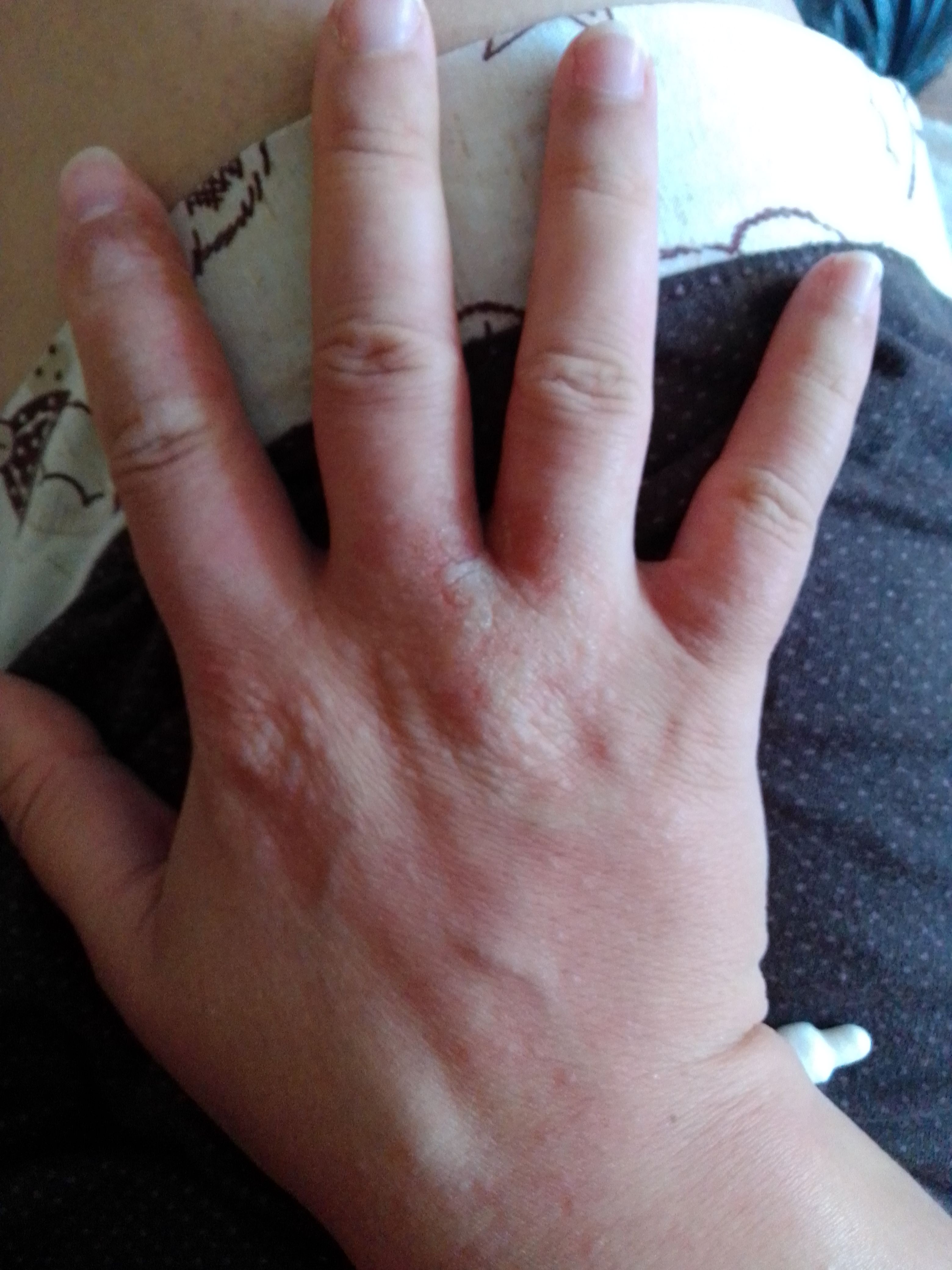 Либо экзема, либо очень сильно пересушенная кожа, которая страдает от моющих средств. Помогают какие-то кремы, мази? Бытовые дела только в перчатках Вам.