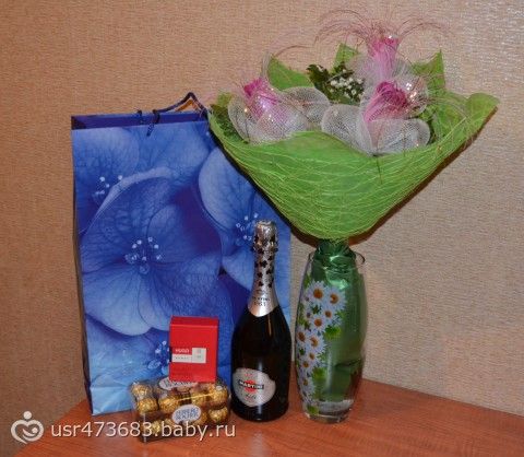Мой вот так поздравил: Любимое шампанское Asti Martini, конфетки FerreroRocher, духи Hugo Boss «Hugo Woman» и конечно же небольшой букетик