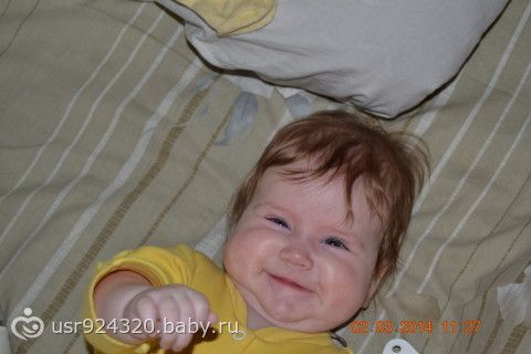 Ура!!! Нам пол годика!!! Даже не верится, что мы уже такие большие!!! Наконец-то научились переворачиваться на животик! Правда только через правый бочок, ну ничего!!! Зато теперь это наше любимое занятие)) Даже переодеться и памперс одеть не дает, только на спину положишь, сразу на животик брык)) А ещё стали пытаться поднимать попу и хотим уже ползти, но пока плохо получается, только по-пластунски немного передвигаемся — чуть-чуть)) Очень хотим сидеть, но пока не садимся. Только из положения лёжа на спине активно пытаемся сесть, почти не лежим, а постоянно напрягаем корпус и задираем кверху ноги)) ещё любим стоять, стоит на полной стопе, но держу её подмышки. Мы по-прежнему на ГВ, но молока мне кажется уже маловато становится. Кушаем цветную капусту, начала вводить брокколи, ей нравится. Давала яблочко — кривится, но кушает)) А вот кабачок не едим вообще, плюемся. Неделю назад весили 6605, рост 63 см! Наша дюймовочка)) Очень говорливая девчонка растет, когда мама целует, смеется в голос)) Любимка моя! Счастье моё! Я не представляю, как жила раньше без этого чуда! Моя кровиночка и папин гномик))