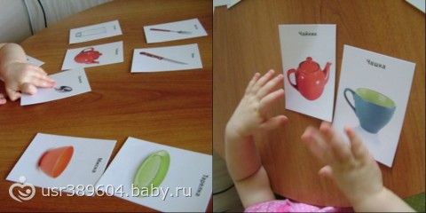 Начали с карточек «Смотрю.Играю.Узнаю» Называла предметы (все их она знает уже), просила «Покажи...», «Дай карточку с чашкой» и тп.