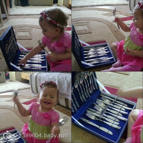*** Потом принесла столовый набор ложек, вилок и ножей. Изучали, закрепляли, вытаскивали, гремели ложками, отрабатывали понятия «один-много» (одна ложка в коробке, много ложек в наших ладошках и тп), потом поиграли ложкой по вилкам как на ксилофоне. Куча восторга у дочи)