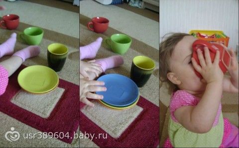 *** Потом играли с чашками и блюдцами. Подбирали пары по цвету, изучали круглую форму блюдца, показывали для чего нужна чашка.