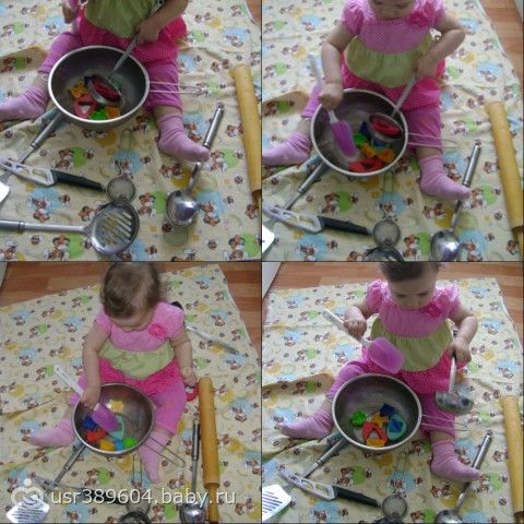 *** Чтобы спокойно прибрать посуду после завтрака, разложила дочурушке тут же на кухне предметы кухонные, называли и показывали их, потом показала как зачерпывать и перекладывать, и спокойно прибиралась, подбадривая и похваливая малышку за столь сосредоточенный труд) Доча минут 15 была очень увлечена этими «игрушками» и манипуляциями с ними.