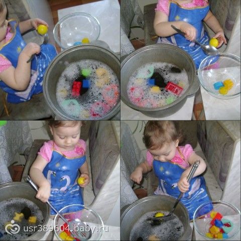 **** Пока пыл дочки не угас, приготовила две ёмкости, шумовку и всякую игрушечную мелочь. САМОЕ ПОНРАВИВШееся и любимое её занятие -возиться в воде и с водой))) Перекладывали из чугунного казана в стеклянную посуду предметы с помощью шумовки. Обратите внимание — старалась задействовать и правую, и левую руку малышки, что способствует гармоничному развитию обоих полушарий мозга. К слову, девочка моя неплохо справлялась обеими руками.