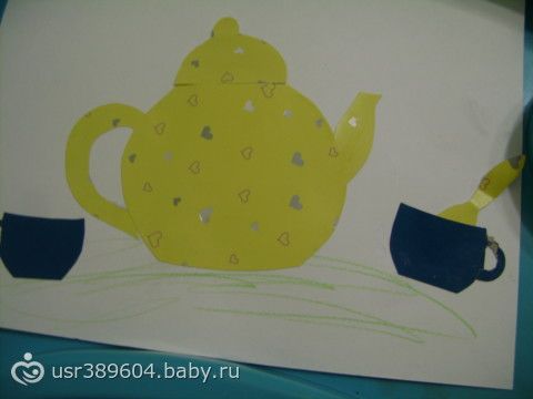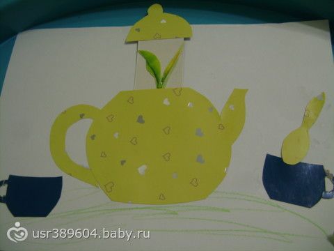 **** После ужина делали аппликацию — чайничек и две чашки. аппликации с секретом. В чашки можно вложить ложечки, а крышечка чайничка открывается-вытягивается и видны чайные листочки))