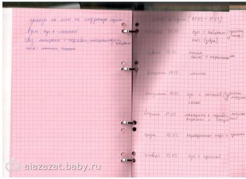 Как только начала летать с вами, стала составлять и работать с меню. В контрольном журнале выделила блок страниц для этого. С утра (как раз в среду) убираю в холодильнике, проверяю что там есть, а что надо докупить и составляю меню на неделю. В выходные, когда есть время спрашиваю у своих мужиков, что они хотят, чтобы было в меню на следующую неделю, они диктуют, я записываю просто список, например Аяз: картофельное пюре с мясными оладушками, пицца,… Азат: суп с лапшой, винегрет, плов… Ильнур:… принимается всё, вплоть до салатов и напитков. Потом ещё они бывает дополняют: «Мам, а можно ещё...» Если это до среды, дописываю в тот же список, если позже, то остаётся на следующую неделю. А в среду составляю из этих списков меню, чередуя так, чтобы не было подряд однотипных блюд, дополняю своё, если не хватает.