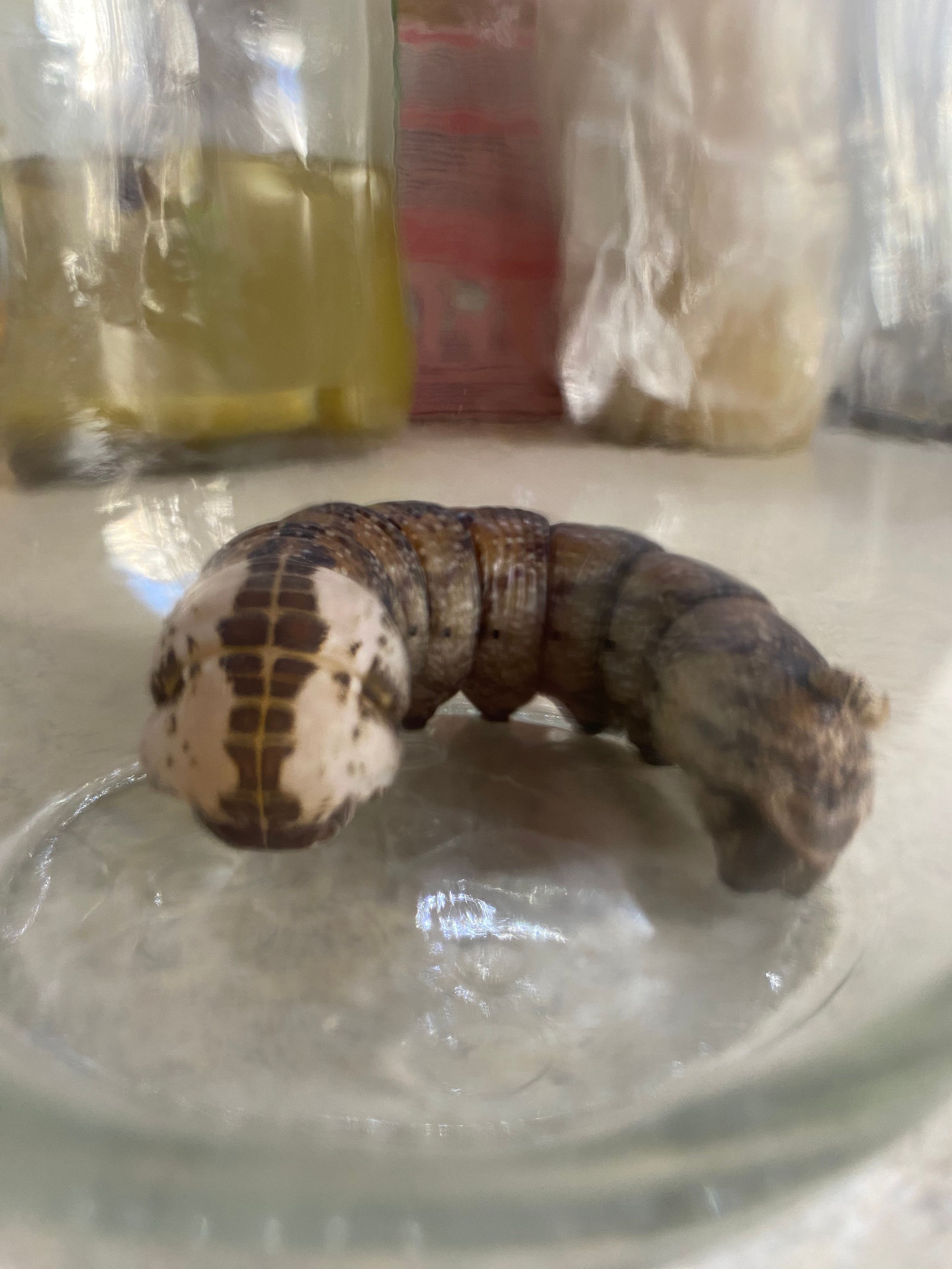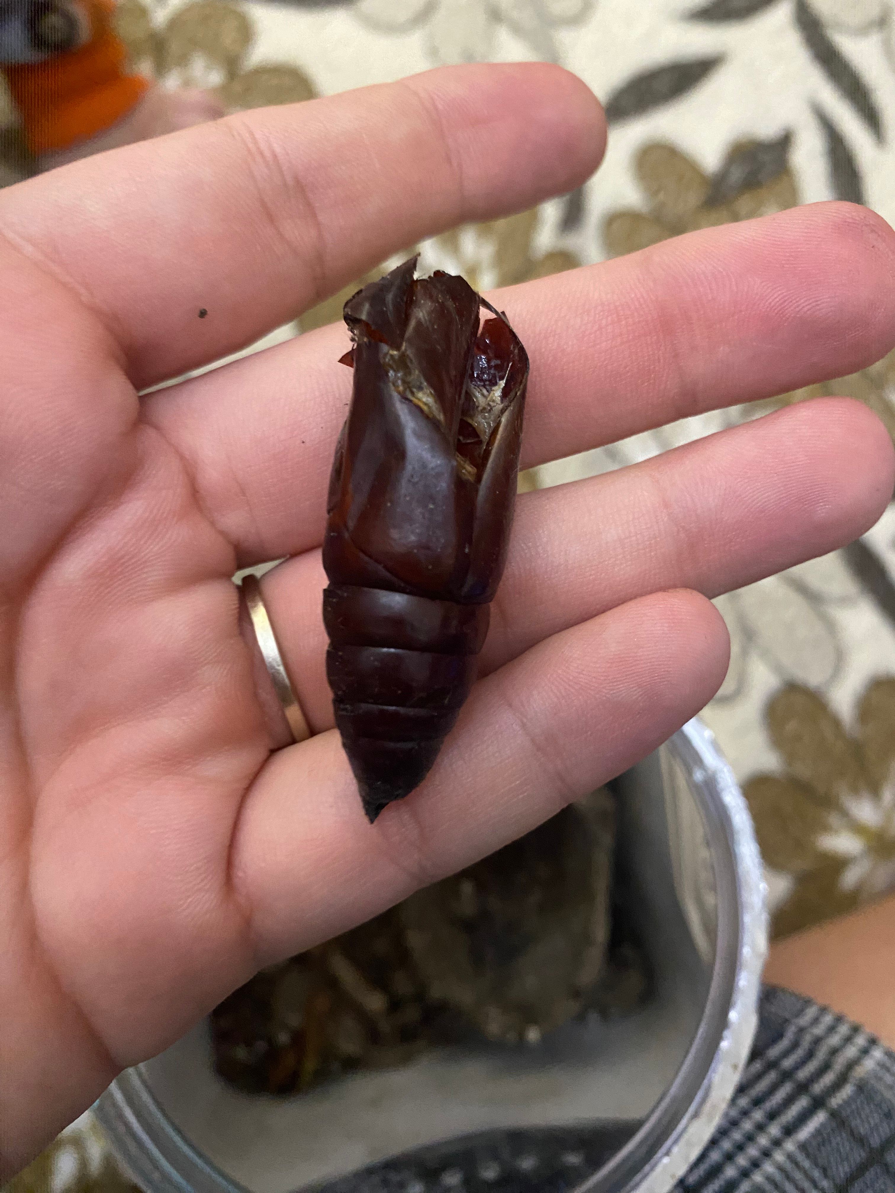 Гусеницу нашли уже в окончательном виде и состоянии, при нас она сразу стала искать место для того, чтобы окуклиться. И 3 месяца она была куколкой. Сейчас подкармливаем разведенным медом