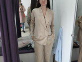 Костюм брючный, но обратите внимание на цвет… вам пойдёт изумрудный, или винный, глаза ярко накрасить, и губы нейтрально?