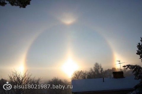 явление довольно редкое и называется оно «гало». Обычно, оно появляется вокруг Солнца или Луны. Возникает тогда, когда происходит преломление света в кристаллах льда у поверхности земли. Причем происходит это, как правило, в мороз.