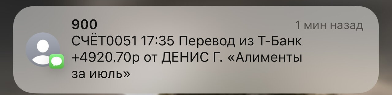Пожалуйста, помогите разобраться. Судом присвоено твердая сумма алиментов на меня и дочь-33 к. В мае вступило в законную силу, подала в марте. Ни разу не платил. В июле в конце мне звонят из суда и говорят что муж бывший взял копию решения суда чтобы оспорить, якобы устроился официально . Я к нему, он говорит да, устроился на полставки- 8000 примерно. Не знаю, подал или нет, суда никакого не было. В госуслугах все те же исполнительные производства на 33 к. Долг уже с марта 132 к. Сейчас мне приходит сообщение из банка - фото прилагаю . Что это за странная сумма??? Что за перевод, непонятно ничего, он молчит. Это с работы его отчисления? Почему так мало тогда?