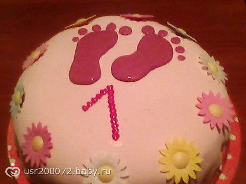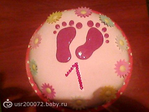 Ну вот, ровно год назад я лежала в родовой со схватками… а потом все прекратилось. И утром следующего дня меня экстренно прокесарили. Дочка родилась в то время как и я, в 9-15, с папиным весом, 3410)))) Ух, до слез прям все вспоминаю. Год не просто прошел, он пролетел одним днем. Она уже такая большая, смышленая. И вот я решила сама, для своей малышки, сделать ее первый тортик. Впервые работала с мастикой. Но что, вышло, то вышло… Еще и юбочку ту-ту сделала))) Завтра будем веселиться и радоваться нашей малышкой)))