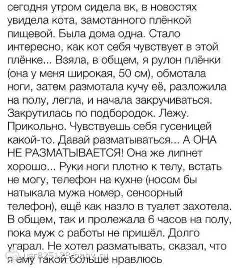 Что то я не могу представить как руки то замотать себе. Да и вобще носом она мужу позвонила, а за шесть часов не об какой угол/кручок/ножик/гвоздь — зацепиться и порвать не смогла?)))