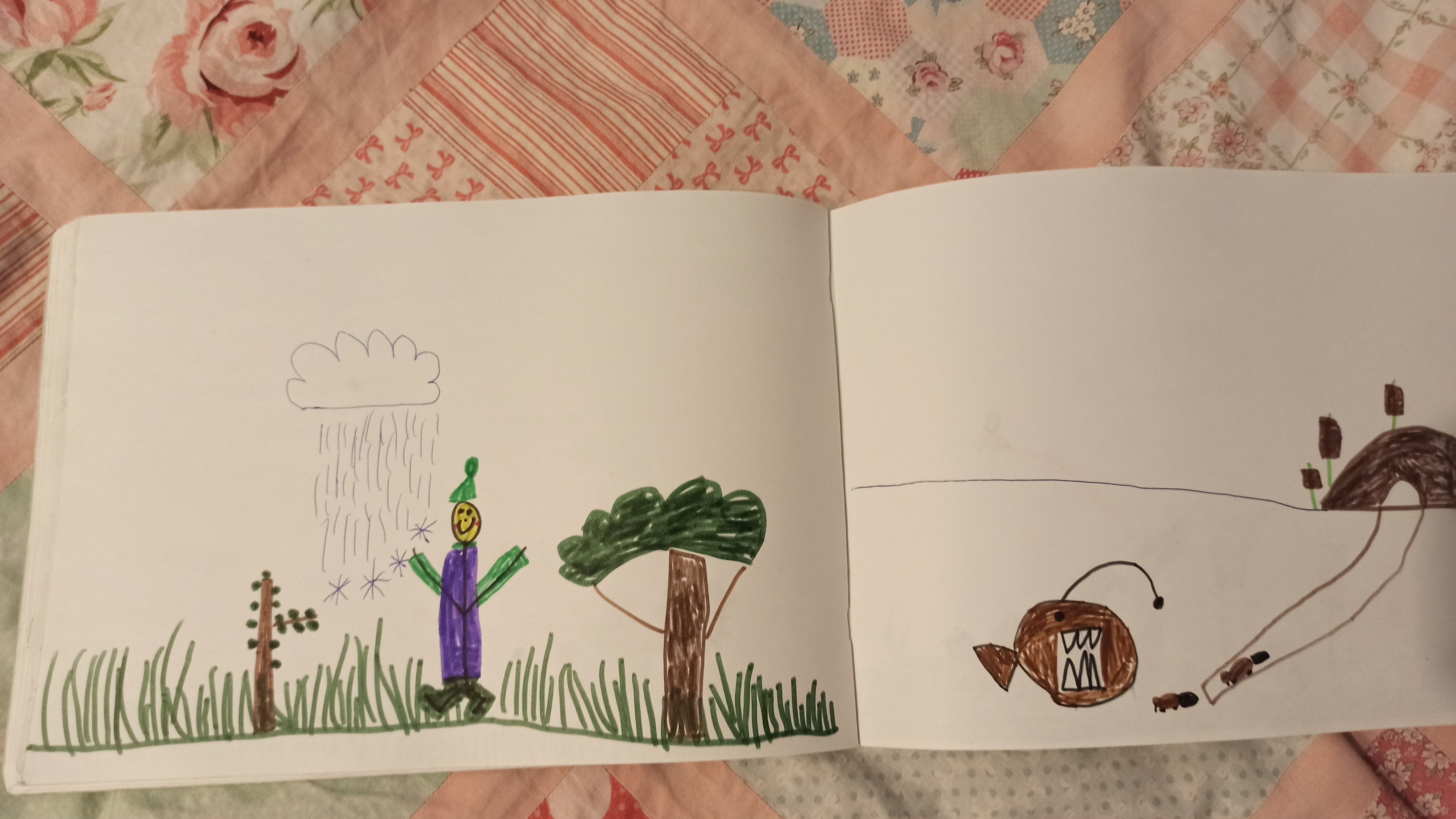 Наша пока ещё пятилетняя Лиза спидранит рисование каждый день по часу, я бумагу заказываю коробками))). Не помогаю, считаю, что одного художника в доме достаточно, пусть лучше врачом или экономистом будет. Сегодня вечером драматичный сюжет: пираты в модных кроссовках украли принцессу в шторм и утащили её в плавучую тюрьму. Нос корабля венчает скульптура-утка в пиратской шляпе, мачта гнётся и трещит, но тащит судёнышко через бескрайний океан.