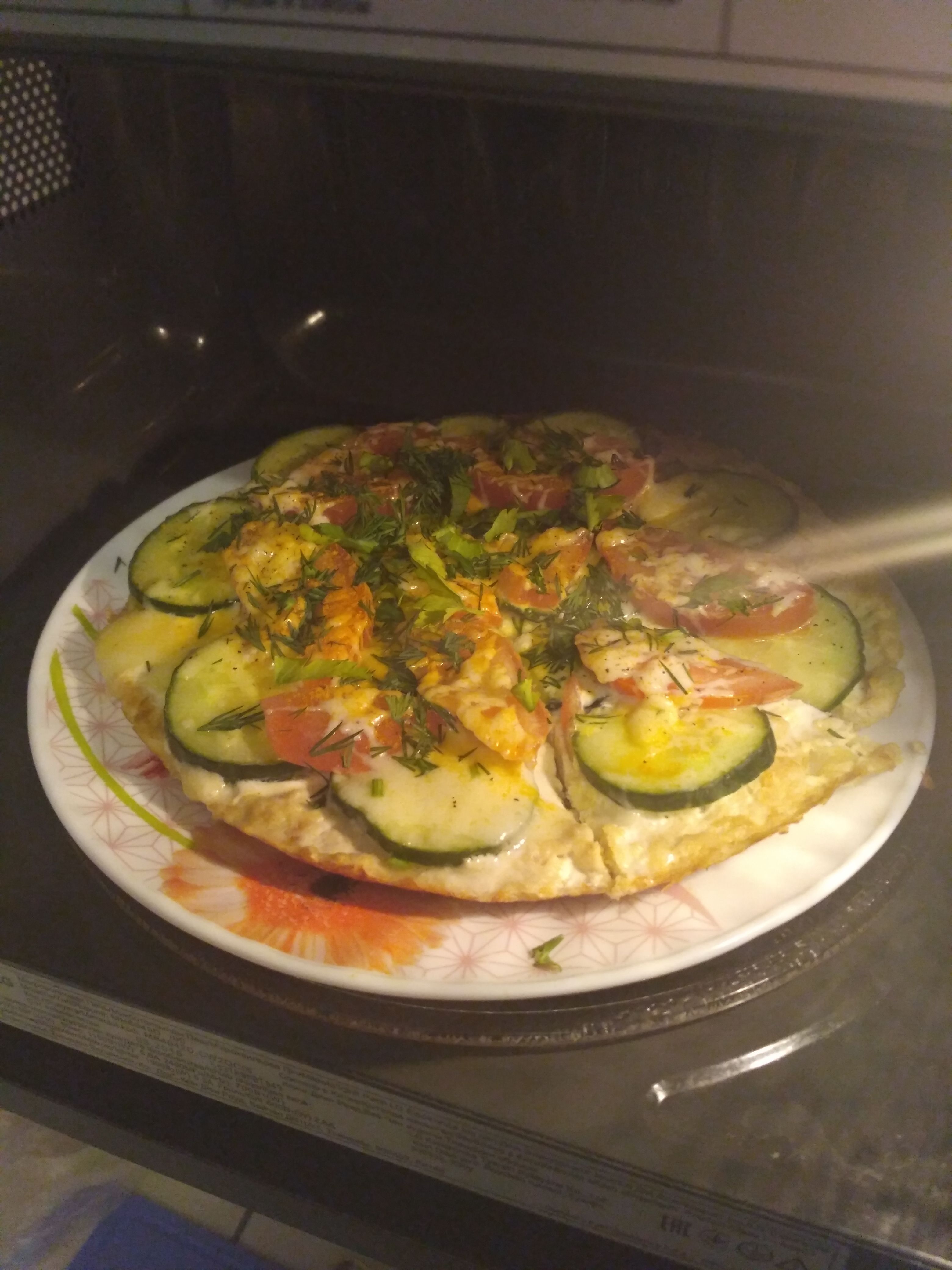 Общая калорийность в таком варианте составила около 420-430 ккал. Примерное соотношение бжу 31/23/23. На вкус конечно отличается от привычной пиццы, но тоже очень неплохо. Я этот вариант теперь использую частенько в разных вариантах начинки.