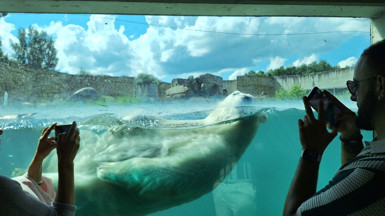 Больше всего детям понравился жираф и белый мишка. Обезьянки повеселили, ловко прыгая по лианам. А, увидев черную пантеру, дети дружно замяукали)))