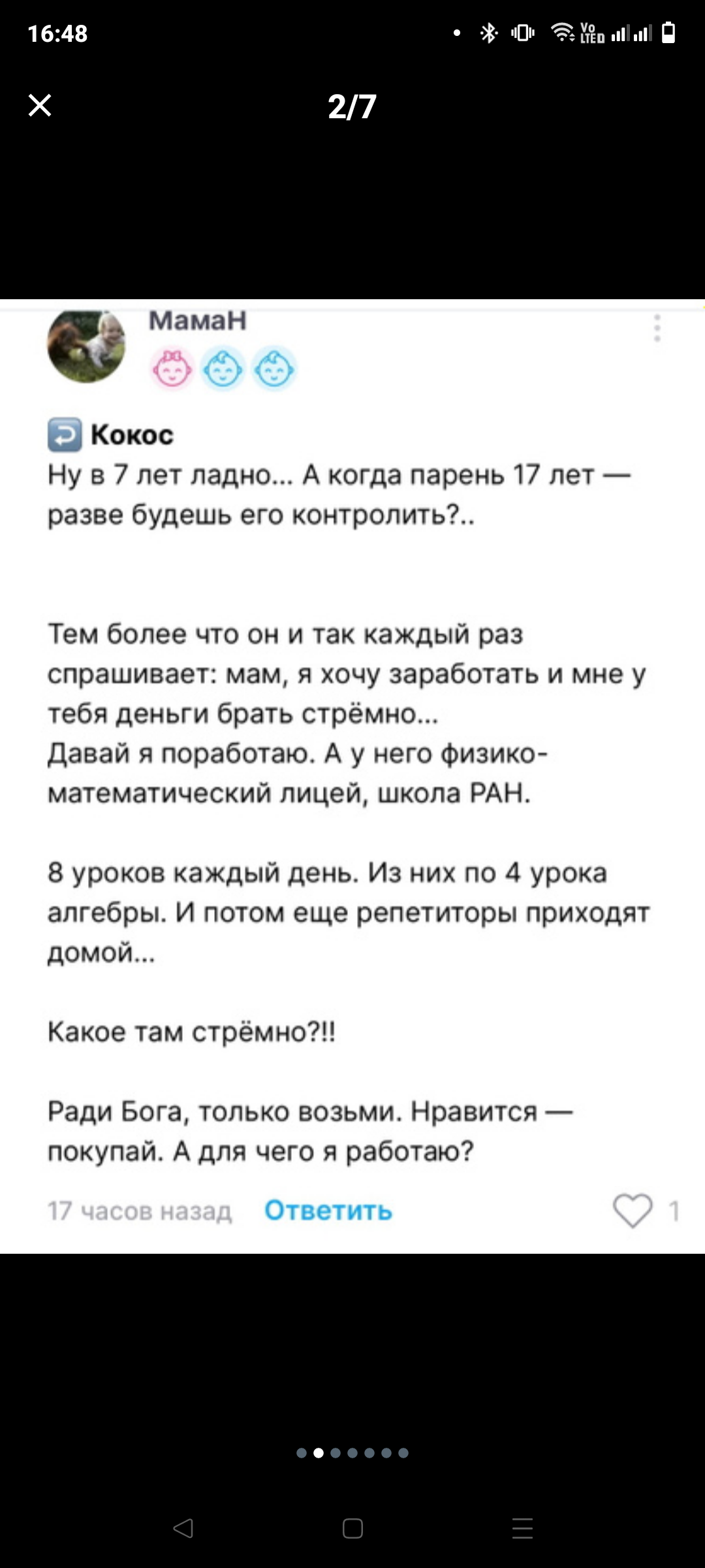 Это, кстати, пост- ответка на пост другой девушки о коммуналке. Она написала пост, что пятнадцатилетняя дочка предъявила ей, что надо давать ей деньги с аренды квартиры, так как в квартире есть её доля, а мать тогда ей сказала, что без проблем будет давать ей деньги от аренды. Ну, тогда коммуналку за свою часть, за своё проживание и часть за продукты придётся отдавать матери обратно, вкидываться в общак, раз такая ситуация сложилась, и они и дочкой посидели, поговорили так все поняла, я отказалась от этой затеи и вот. Маман решила, что пятнадцатилетнюю девушку сильно ущемляют, ничего ей не дают, бедный ребёнок страдает, у неё душа болит, ну и так далее и тому подобное там где-то есть комментарий про это. И написала вот этот ответный пост.