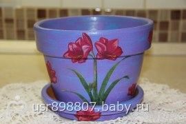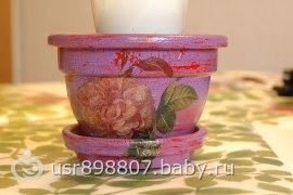 О декупаже узнала случайно, на одном из наших волонтерских занятий в детском доме. Мне этот вид творчества так понравился, что «заболела» им наравне с вязанием. И так получилось, что первой моей работой был ноутбук в данной технике, а потом цветочные горшки. В принципе, на них я и «профилируюсь»)))