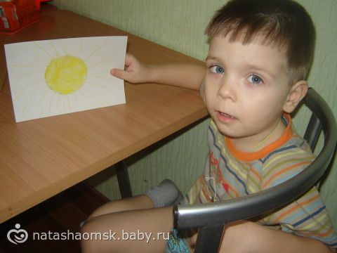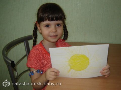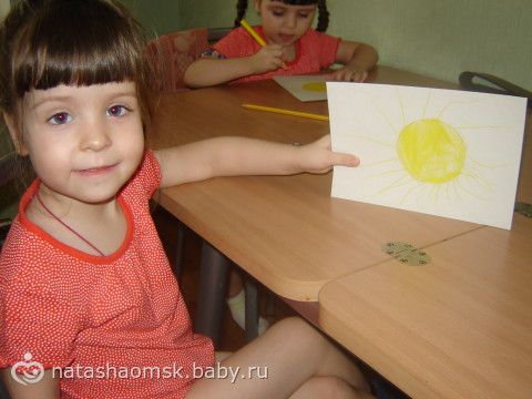 Сначала дала деткам картон на которых был нарисован один кружок, раскрасив его желтым цветом и нарисовали лучики, заодно повторили какой формы солнце)))