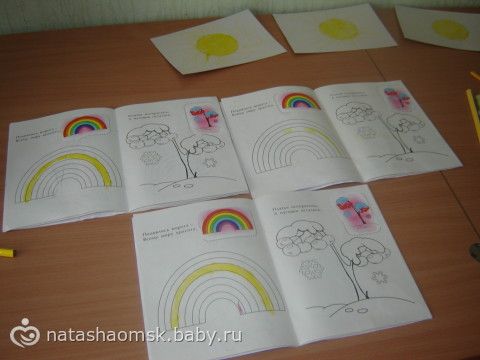 В общем для занятий я сначала нарисовала на одном картоне кружок, а на другом три кружка… (в трех экземплярах конечно), нашла в раскрасках радугу (к счастью детки ее еще не успели раскрасить), еще вырезала из цветной желтой бумаги кружочки и достала только желтые мелки.