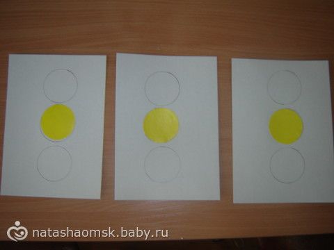 Затем мы преступили к следующему упражнению. На картоне я заранее нарисовала три кружочка в ряд, подразумевая светофор)))) Это детки не отгадали, зато все вспомнили, что на картоне изображен круг!)) Я раздала всем по желтому вырезанного из цветной бумаги кружочку и мы его наклеили в средний кружок ( у этого упражнения будет продолжение, так как день «Ягодок» (красный) и день «Травы» ( зеленый ) у нас еще впереди). А пока вот, что у нас получилось: