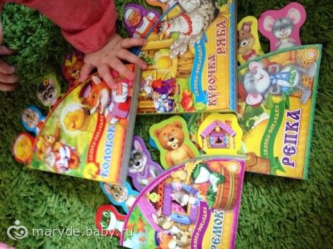 1. Пополнила коллекцию книжек закладок, раньше у нас была только Репка, теперь еще три. Доченьке очень нравятся картинки, и играть с этими книжками могут даже самые маленькие, но есть одно НО, текст книжек немного отличается от классического варианта и поэтому показывая картинки я рассказываю сказку из головы. Но за счет ярких красочных картинок и закладок — эти книжки того стоят.