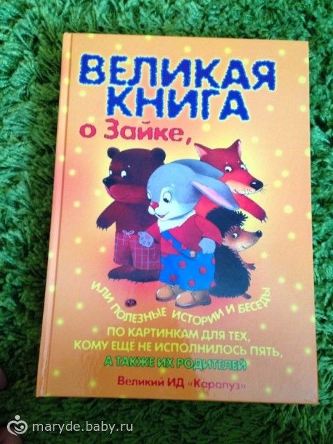 2. Следующая книжка про зайку, в ней много материала для взрослых и именно в ней объясняется все на свете, и как играть в прятки, и понимание большой\маленький, и времена года, и даже как грести в лодке. Можно сказать все обо всем в рассказах и поучительных притчах. Книга предназначена для малышей с одного года и до 4 лет). Интересная, но без взрослого пока ее не оставишь, страницы тонкие.