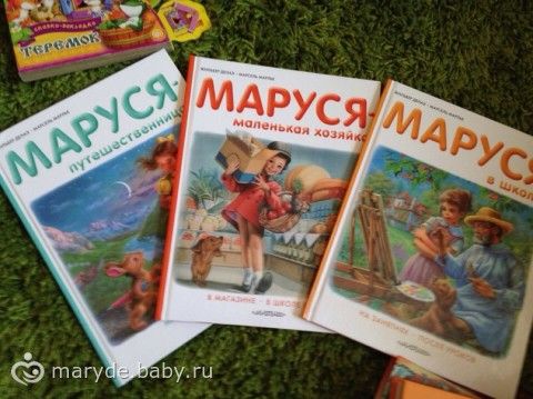 7. И последнее: три книжки под названием «Маруся… там-то, там-то». Мне очень понравились книги, в них есть иллюстрации, и в зависимости от тематики книги, Маруся изучает и узнает много нового об окружающем мире. Например, она идет в магазин и разбирается что такое Канцелярский отдел и что в нем продают, и тд. Так же про путешествия, что нужно взять с собой и как проводить время в поездке. Написано легко и доступно для детей. Но опять же страницы тоненькие и для проходдения этих книжек, ребенок уже должен осознавать, что происходит вокруг и отвечать, взаимодействуя с родителями)