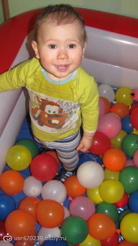 в 11мес купили бассейн надувной накидали шариков и запустили туда-только восторг был-никаких пуганий..