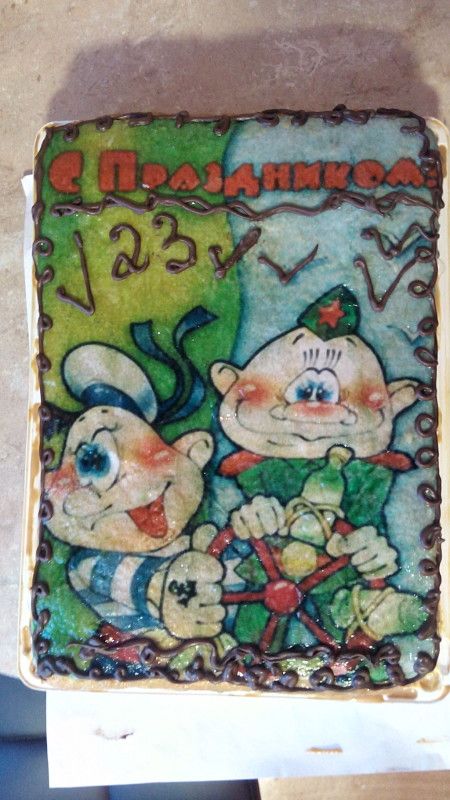 Получился вот такой:Карамельный бисквит, сырно-сливочный крем, банан. Перед тем, как отдавать, картинку покрыла декор-гелем, так что на деле она еще ярче стала))