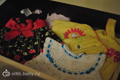 От Анжелички в основном платья остались — рука не поднялась их отдать, решила, если и сын у нас когда-нибудь родится, то значит дочка в них будет кукол наряжать, а нет — еще поносим)))) А так почти все вещи первых размеров успела раздать, пришлось новое покупать))))