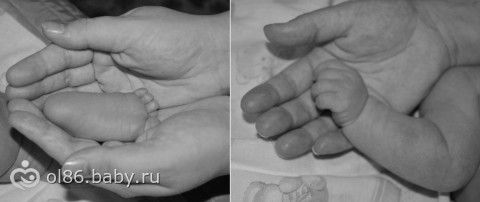 Да, носочки крохотные, а на ножках в первое время все равно большими кажутся, такие ножки маленькие))))) Нашла фотку, Анжеликина ручка и ножка в 1 неделю.