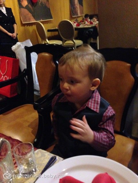 Он почему-то решил присесть не за детский стол, а за взрослый))) и напрочь отказался от прилагаемого к костюму галстука. И даже от бабочки. В отличии от брата