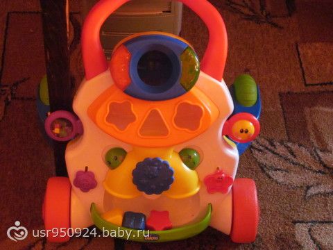 малышка уже наигралась.при ходьбе звучит музыка по бокам погремушки звуковые спереди развивающий центр.с различными фигурками которые закидываются в спец отверстие и при этом звучит музыка