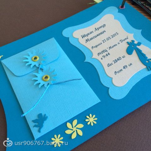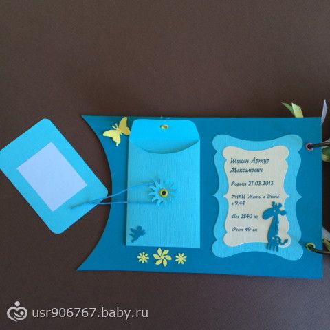 И немножко подробностей: на первой страничке кармашек для бирочки из роддома и данные о рождении Артурчика.