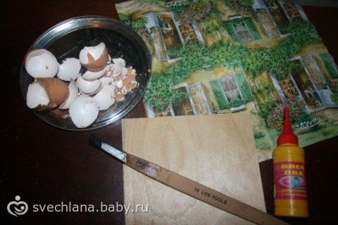 Понадобится: яицная скорлупа, клей, салфетка и дощечка (можно использовать блюдце, или любой другой предмет любой формы, главное не очень большой для первого раза).