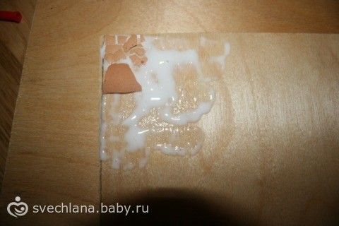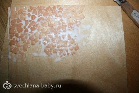 Обильно наносим клей и кладем скорлупу, дальше ее пальчиком прижимаем и она ломается, чуть, чуть раздвигаем кусочки, чтобы получилась как мозаика.