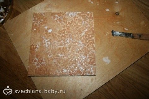 Покрыли всю досочку. Для надежности чуть подождем и смажем поверху клеем, особенно в тех местах, где вы не уверенны, что приклеилось.