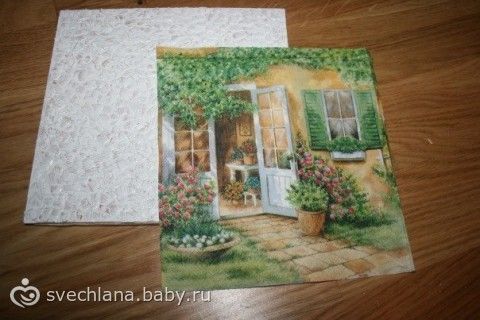 Вырезаем мотив салфетки, отрываем нижние слои, оставляем только верхний красочный.