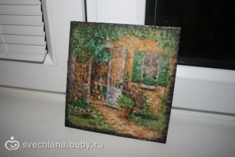 Клеим салфеточку. Разводим темную краску, коричневую ближе к черному, и по краям нашего рисунка тоже губочкой аккуратно проходимся, тем самым состаривая картинку и закрывая переход от салфетки к дощечке. Теперь можно из этого панно сделать например часы.