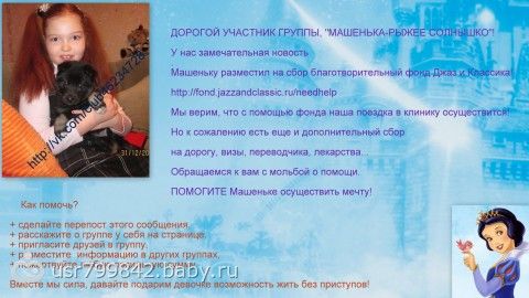 Друзья! Обращаемся ко всем людям, которые смогут понять наше родительское горе! Мой муж, будучи молодым парнем, из обычной рабочей семьи, участвовал в ликвидации последствий аварии на Чернобыльской АЭС. Он считал своим долгом, помочь нуждающимся людям, пострадавшим в следствии этой аварии. Спустя два года после Чернобыля у нас родился сыночек Темочка. Сколько было радости и планов на будущее. Ничего не предвещало беды. Но в возрасте одного года у сынули случился первый эпилептический приступ. С этого дня наша жизнь превратилась в кошмар и в постоянные мытарства, а так же в поиски того, как помочь маленькому человечку. Приступы были частые, мы каждый раз боялись, любой приступ мог оборвать крошечную жизнь. Объездив и пройдя все, что только можно было, улучшений не добились, у сынули появились агрессия, страхи, галлюцинации, провалы в памяти, он стал забывать все то, чему раньше научился. Жизнь превратилась в сплошную черную полосу. Мы очень хотели второго ребенка, но боялись. Cделав все рекомендованные генетические обследования (генетика не выявилась) мы решились на этот шаг. В 2001 году Боженька послал нам дочечку Машеньку. Какая же радость наполнила наш дом. Мы были безмерно счастливы. Ребенок родился абсолютно здоровым, уверяли врачи. Все восхищались ее необычным, рыжим цветом волос. Но радость и счастье в нашем доме было не долгим. Имея проблему с сыном, я более насторожено относилась к Маше. В пол года ( когда она села) я начала замечать заваливания назад. Мы сразу же обратились к врачам. Но врачи успокоили и посоветовали не паниковать. В 2 года, после перенесенной ветрянки, у Машеньки появились серьезные проблемы со здоровьем. Постепенно начала нарушаться координация движения и спустя две недели она совсем перестала ходить, сидеть, держать голову. Мы сразу забили тревогу, боясь ничего не упустить. Просто не верилось в то, что в семью пришло горе во второй раз. И не было ни одного дня, что бы мы не искали новых путей в борьбе с болезнью. Машеньку обследовали во многих ведущих клиниках Украины и России. Она прошла через многие мучения: пункция, плазмофорез, многочисленные капельницы и уколы, постоянный прием таблеток… В апреле 2013 года, благодаря отзывчивым, добрым людям и Российскому фонду Маша прошла обследование в Германской клинике Шон. Был выставлен диагноз: тяжелая форма эпилепсии. Немецкие доктора рекомендовали приехать на подбор препаратов на более длительное время, так как все препараты имеющиеся в нашей стране мы уже принимали, безрезультатно. В Европе имеются еще много лекарств, которых к сожалению нет у нас. 12 лет обследований и возможно неправильных назначений препаратов. Много разных диагнозов. Улучшает ее состояние только гормональный препарат Дексаметазон, да и то на короткое время(2-3 месяца). Так как клиника в которой Маша обследовалась, частная и счет на подбор препаратов огромный, мы обратились в ряд других клиник Германии. Остановили мы свой выбор на государственной клинике Шомберг.Клиника предлагает нам то же лечение, только в половину дешевле. Счет с клиники 13 170 евро. Для нашей семьи и эта сумма непреодолима, в семье работает один отец. Нет сил, болит душа и разрывается сердце от безысходности. Невыносимо смотреть, как страдает наша кровинушка. Она постоянно падает. Вследствии чего ссадины, слезы и мольба о помощи.