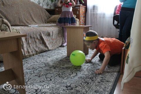 Ставятся на расстоянии друг от друга две табуретки. Около одной кладем надутый шарик. Нужно на четвереньках додуть шарик от одной табуретки до другой, обогнуть её и придуть шарик к финишу. Помогать ни руками, ни ногами нельзя. Это испытание понравилось больше всех, каждый проходил его по нескольку раз!