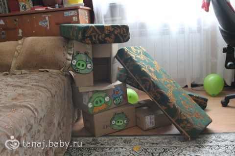 Выстраиваем крепость из коробок (дети помогают). На ней размещаются Плохие свиньи и каждый из рогатки стреляет по свиньям. Нужно сбить всех Bad Pigs.