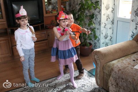 Встретив гостей я объявила, что коварные свинки украли у нас праздничный торт и требуют, чтобы ребята прошли ряд испытаний. За каждое пройденное испытание, они будут получать часть карты, собрав которую в конце узнают где же свинки спрятали торт. И веселье началось.