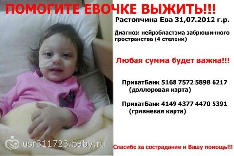 Мама Светлана 063-977-95-88 В середине января 2014 года вокруг глаз у ребенка появились синячки. Обратились в поликлинику, доктор предположил, что это последствия ушиба. У офтальмолога проверили глаза, по совету хирурга сделали рентген головы. Никаких беспокойств результаты не вызвали. Вскоре у девочки увеличились лимфоузлы и припух правый висок. Вызвали бригаду скорой помощи, ребенка забрали в больницу, сделали УЗИ головы, рекомендовали примочки и отпустили домой. Состояние дочери беспокоило родителей и они решили пройти обследование на КТ. У ребенка обнаружили новообразование и родители самостоятельно приехали в НИР. С февраля 2014 года Ева начала лечение в отделении детской онкологии Национального института рака.