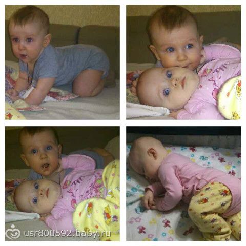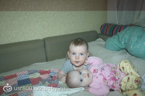в общем опыт интересный, было легко с ними двумя, но это только потому, что девочка такая тихая попалась, если бы у меня было два таких разбойников как мой сын я бы наверное очумела. И я еще считаю, что детям нужно общаться друг с другом даже в таком маленьком возрасте. Этот вывод напросился когда мой сын резво пополз на встречу к девочке, при том, что он вперед почти не ползал, плохо получалось) А девочка впервые засмеялась, когда сынулька добрался до нее и начал грызть-сосать ей ухо)))